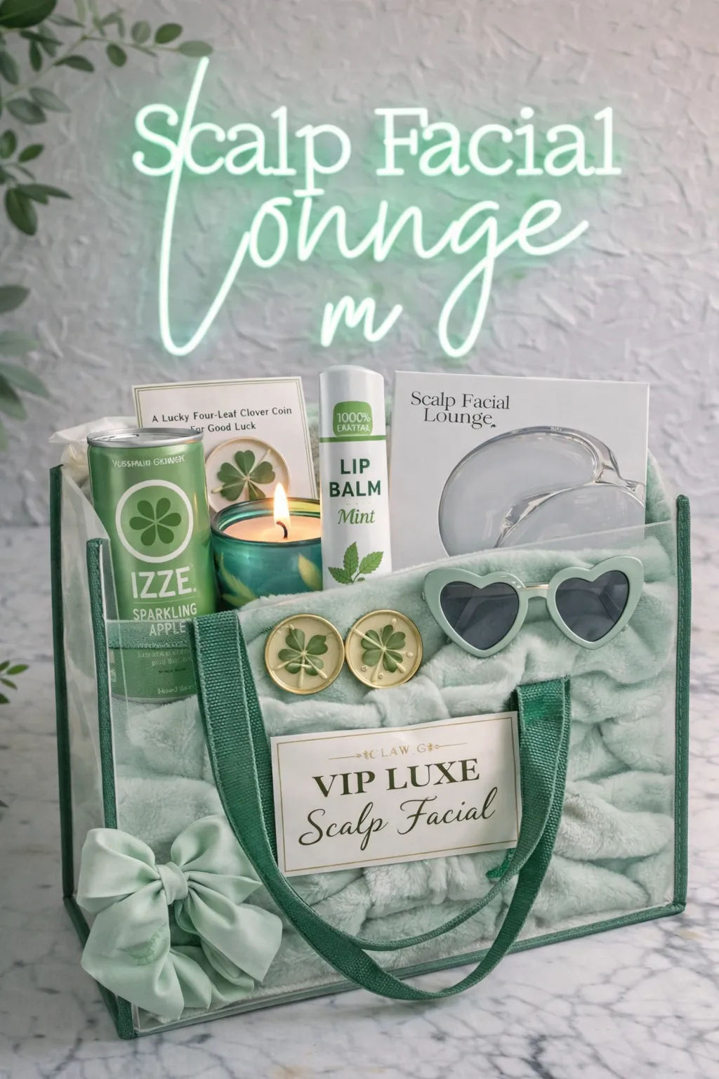 #ScalpFacialSwagBag that includes: IZZE Sparkling Green Apple Drink , Peptide/Collagen Eye Mask, Green Claw Clip, Mini (Capri) Candle, Green Plush Hair Wrap, Fun Green Heart Sunglasses, Utah Truffle, Plant-Based Mint Lip Balm, and 2 Samples of Hair Growth Supplements